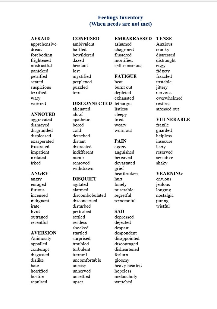 - Feelings point to needs being met or unmet. For example we feel ecstatic, joyful, happy and elated when our need for love, cooperation and kindness are met. A list of wider feelings for when needs are met can be found here. However, we may experience other feelings when sad, lonely, upset or agitated when those same needs are unmet. For further examples of these feeling see here.
